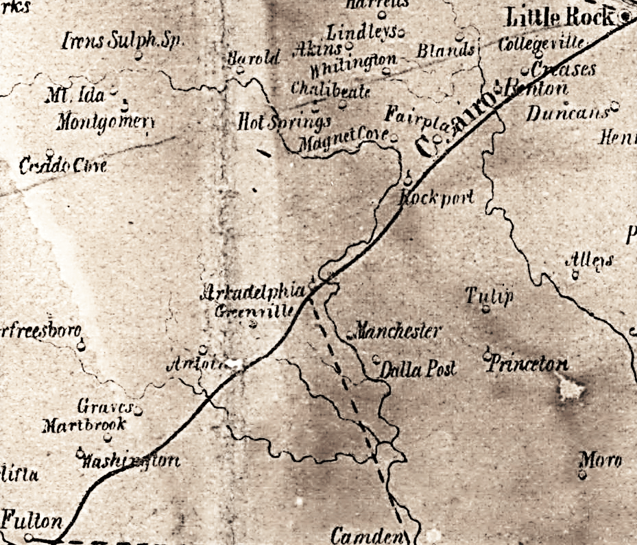 During the Civil War, on September 10, 1863, Union troops occupied Little Rock. General Frederick Steele’s Union army constructed a pontoon bridge south of the city and moved up both sides of the stream. After skirmishing at Bayou Fourche, the Confederates withdrew. Major troop movements took place as soldiers moved southwest along the Military Road. State government operations eventually got underway at Washington in Hempstead County, where they continued until the end of the war. Among the soldiers who made their way from Little Rock through Hot Spring County and on further south, was Richard Perry Harrison of the Confederate States Army.