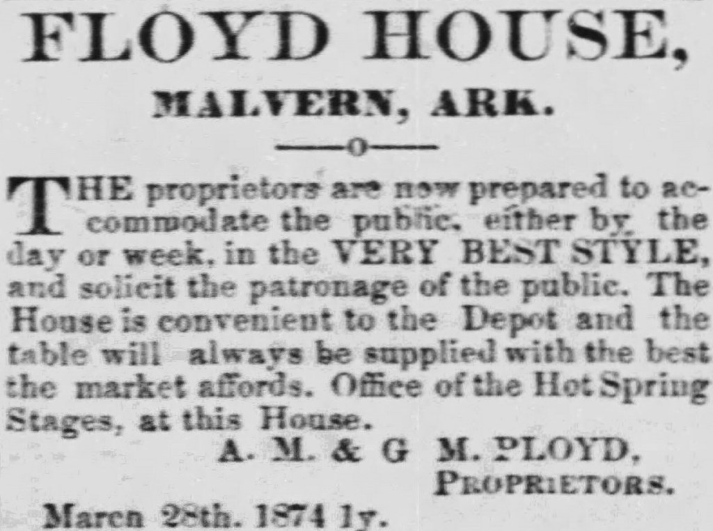 The editor of Arkadelphia’s Southern Standard newspaper visited Hot Spring County in the summer of 1874, about a year following the railroad’s arrival, and echoed the changes described above: “On last Monday, we made a business trip to Malvern and stopped with our friend, A.M. Floyd, who keeps a first-class hotel convenient to the depot. He has recently overhauled his house and is now fully prepared to accommodate all that will stop with him. After eating dinner, Mr. Floyd kindly loaned us his horse and we rode over to Rockport, about two miles’ distance, and spent an hour or two. The place did not present a very lively appearance, but looked more like a deserted city, most of the merchants having moved to Malvern. The Court House that was commenced over a year ago is not yet completed. Crops that we saw on the road were looking better than we expected to see them. They have had more rain in that county than we have had in this.”