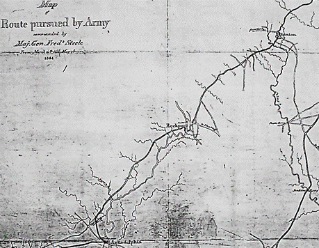 A Union soldier summarized his experiences as a participant in what became known as the “Camden Expedition” in a section of his journal that he titled “Travels of regiment and battles”: Left Little Rock March 23, 1864. Got to Arkadelphia March 29th, 1864. Left Arkadelphia April 1st, 1864. Had a battle at Terre Noir Creek April 2nd, 1864. Got to Little Missouri River and had a battle April 4th, 1864. Had battles at Prairie D’Ane April 10th, 11th, and 12th. Had a battle fifteen miles west of Camden and took the place April 15th, 1864. Left Camden April 26th, 1864. Had a battle at Jenkins’ Ford on Saline River April 30th, 1864. Got to Little Rock May 3rd, 1864.