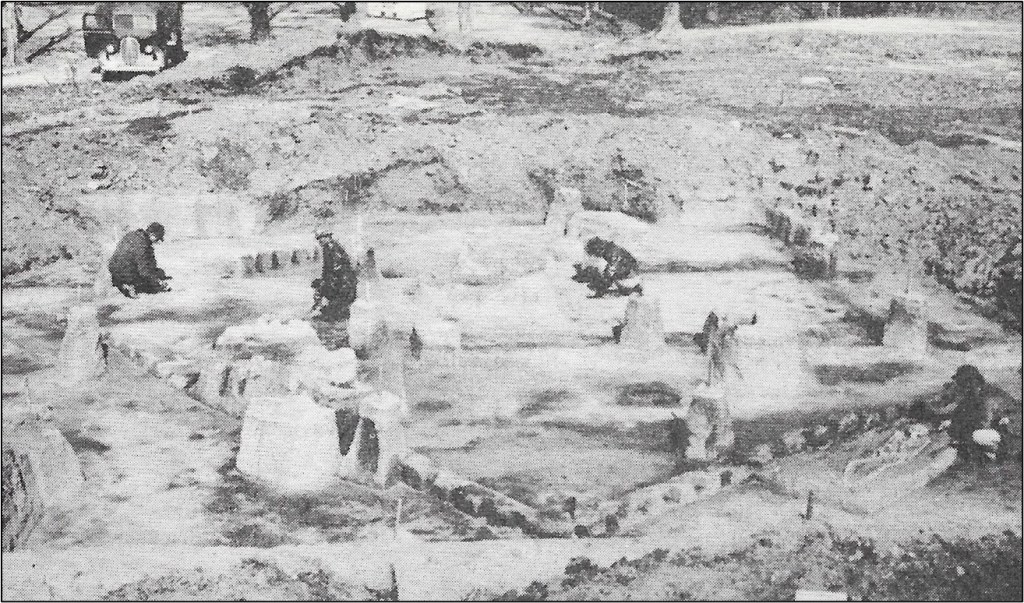 “Several interesting features were uncovered by the Museum’s work. A cemetery area was partially excavated. In a midden area (an area where there is an accumulation and concentration of village refuse and other cultural material), a square house was found and excavated which was approximately 24 feet by 29 feet. The house had been built of upright posts intertwined with reeds of some kind and covered with mud and probably thatch. [The photo by the “U of A Museum” shows workers studying this house, the outline of which can be seen.]