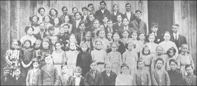 Back row, left to right: Tiny Bradley, Effie Howell, Effie Pittman, Ada Bradley, Avis Housley, Big Jeff Bradley, Ethero Ault, Lewis Thompson, Joe Bradley, Charlie Miller, Howard Beard. Next row: Josie —-, Clara Pittman, Ludie Bradley, Bessie Shuffield, Lee Ault, Coyl Ault, Henry Young, Ernest Talley, Burley Sexton. In between rows: Will Pittman (teacher), Emma Reid Scruggs, Lula Ryan, Ethel Bradley, Mamie Shuffield. Behind front row: Mary Howell, Annie Pittman, —-, Delphie Robbins, John Shuffield, Freeman Pool, Roy Pool, Jim Talley, —-, Willie Sharp, Frank Scruggs, Cleve Williamson, —-, Kelly Sexton, Joe Williamson, —-, —-. Front row: Ruby Talley, Bennie Talley, Estelle Howell, Vela Pittman, Mildred Hatmaker, Hattie Mae Shuffield, Lida Talley, Ollie Thompson, Eva Pool, Vera Pool, Mack Williamson, —-, Dave Bradley, Vander Bradley, Martin Pool, Clyde Sexton, —-, Norvel Williamson
