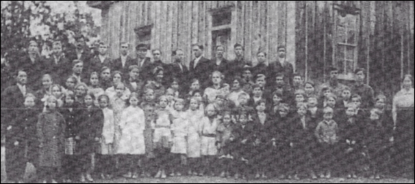 Back row, left to right: Pearl Spiva, Emma Reid Scruggs, Wood Howell, Velle Shaw, Carl Miller, Dret Hill, Henry Hicks, Earl Crawford, — Murders. Second row down: Mamie Shuffield, Ethel Bradley, Zoe Webb, Ludie Bradley, Joe Bradley, Clarence Turner, Jim Talley, Joe Williamson, Frank Williamson. Third row: Flora Scrimshire (teacher), George Murders, Willie Sharp, Freeman Pool (behind), R.D. Scruggs, Jurdy Hicks, Henry Young, Cleo Williamson (eyes), Odas Ryan, Jule Parson, John Lynch, Wallace Miller (teacher). Third row: Eva Pool, Hattie Shuffield, Vera Pool, Ruby Talley, Ollie Thompson (behind), Ruth Talley (next to Ollie), Mary Howell, Ola Miller, Ernest Hall (behind), Mildred Hatmaker, Roy Pool, Parthenia Hicks, Mervin Bradley, Jodie Miller, Lida Talley. Row beginning in front of Ollie Thompson: Pearl Shaw, Virgie Shaw, Ida Pool, Thela Hall, Lena Hall, Estelle Howell, —-, Marion Williamson, —-, —-. Front row: Dempsey Sharp, Dewey Sharp, John Shuffield, Mack Williamson, Ernest Shaw, —-, Jim Hatmaker, Norvel Williamson, Marcus Shuffield, Dave Bradley, Vander Bradley, Frank Scruggs, Paul Talley