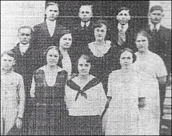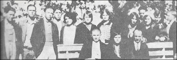 Standing, left to right: Jake Loyd, Orville Sharp, Tolbert Housley, Silas Sharp, Margaret Trammel, Hazel McRee, Hazel Bradley, Laura Williamson, Cecil Loyd, Velma Loyd, Louise Parson, Charles McClelland. Seated: Manuel Bradley, Frances Thompson, Junius Austin (teacher)