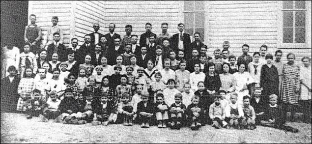 Front row, left to right: Virgie Shaw, John Joe Shaw, Waldo Pool, Jeff Bradley, Raymond Thompson, Ollie Thompson, —- Blakely, Sadie Hall, Vernon Blakely. Second row: Eula Shaw, Pearl Shaw, Ida Pool, Eva Pool, Mildred Hatmaker, Lela Blakely, Vera Pool, Martin Pool. Back row: Elster Blakely, Mrs. Fannie Brown (behind), Velle Shaw