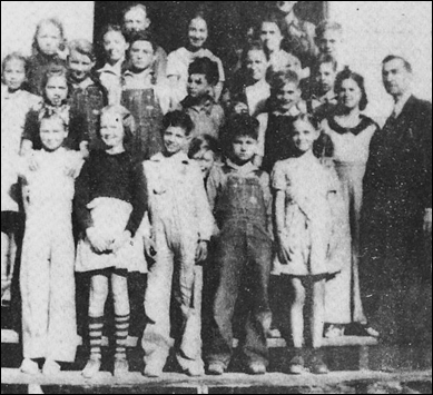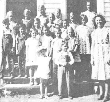 Front: Janelle Chitwood, Verdell Buttrum, Pauline Brown Pitts (teacher). Second row: Tommie Jean Digby, June Wilson, —-, Sue Chitwood. Third row: Bradley Johnson, Grady Pitts, Chrissie Bradley, —-, LaVaughn Bradley, —-. Back: LaNell Hall, Imogene Benson, Mervan Benson, Mearl Hollowoa, —-, —-